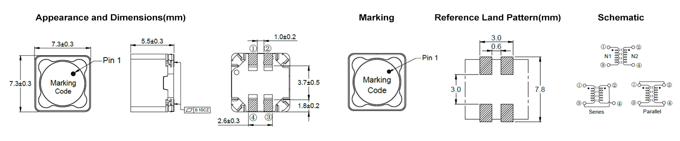 • 电感测试条件为100KHz,1V。